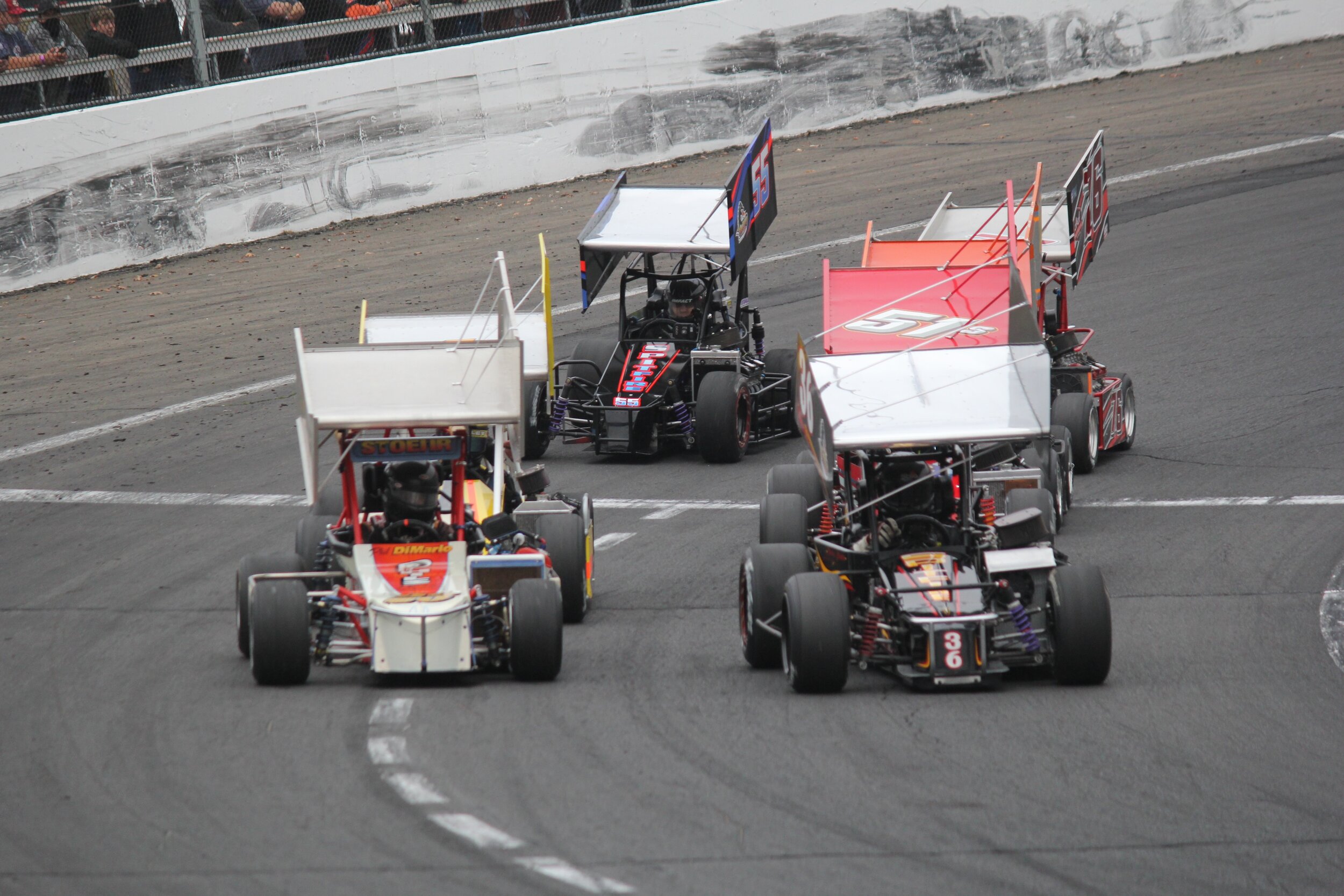 On the restart, it was the former Waterford winner Geoffrey Sutton in Alan Mollot’s championship winning #51S leading the field to the green. It didn’t take long for the #1B of Joey Bailey to slice and dice his way to the lead diving to the inside of Sutton for the lead in turn one after restarting third.